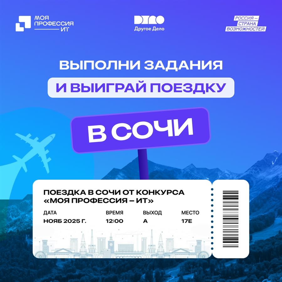 Всероссийский конкурс "Моя профессия — ИТ" президентской платформы "Россия — страна возможностей" направлен на поиск, развитие и поддержку талантливых и перспективных специалистов в области информационных технологий. В сентябре 2025 года конкурс стал частью Бонусной программы проекта "Другое Дело" президентской платформы. Чтобы побороться за путевку в Сочи, необходимо зарегистрироваться в мини-приложении "Другого Дела" в социальной сети "ВКонтакте" (https://vk.com/app7785085#lottery/sochi/) и выполнить два обязательных задания от конкурса "Моя профессия — ИТ".