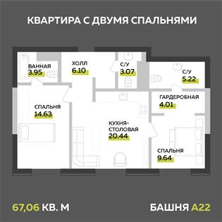Оптимальным вариантом для жизни и инвестирования станет уникальная квартира в башне А22 двумя изолированными спальнями и тремя санузлами, здесь учтены все нюансы для комфортной жизни и абсолютно разных сценариев жизни. Благодаря продуманной планировке с четким зонированием вся площадь квартиры остается полезной. Просторная кухня-гостиная посередине — разделяет спальни и делает их максимально приватными, а сразу две мастер-спальни с собственным санузлом — эксклюзив, который крайне редко встречается в планировочных решениях.