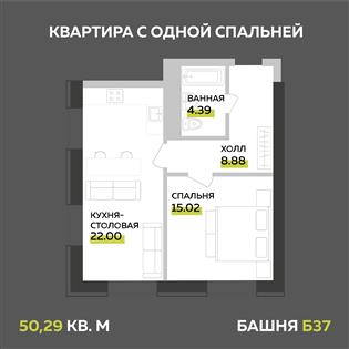 Вот, например, элегантная, эргономичная квартира с одной спальней и просторной кухней-гостиной в башне Б37. Таких квартир в продаже прямо сейчас — всего 2 на 27 и 32 этажах.