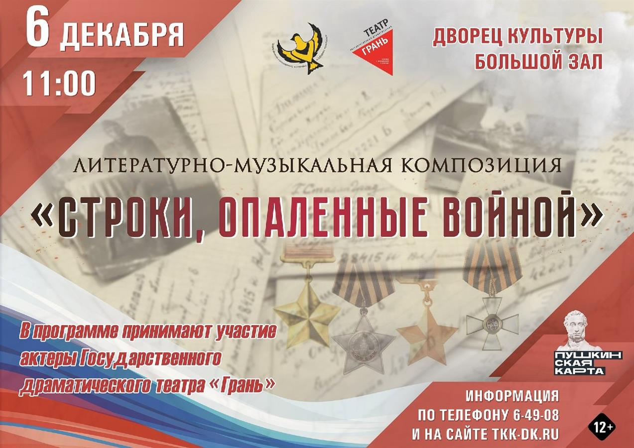 В субботу, 6 декабря, в 11:00 во Дворце культуры состоится литературно-музыкальная композиция "Строки, опаленные войной". Мероприятие приурочено ко Дню Героев Отечества.
