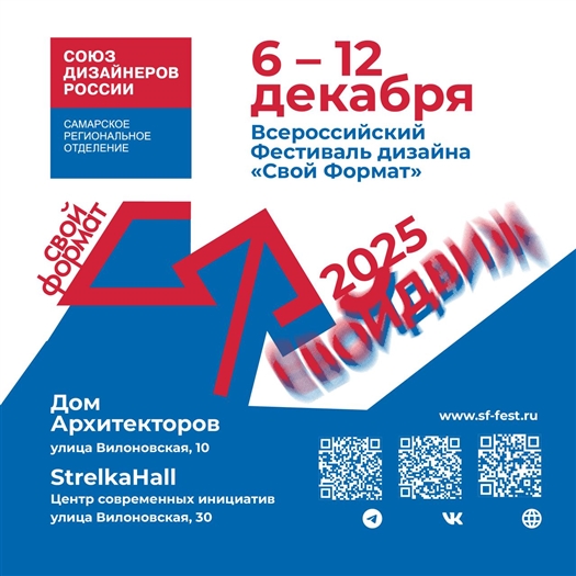 С 6 по 12 декабря в Самаре состоится 12-й всероссийский фестиваль дизайна "Свой формат".Тема фестиваля 2025 года — "Свой движ". Запланированы лекции, мастер-классы для детей и взрослых, открытые занятия, выставки, кинотеатр от кинофестиваля "Соль земли".