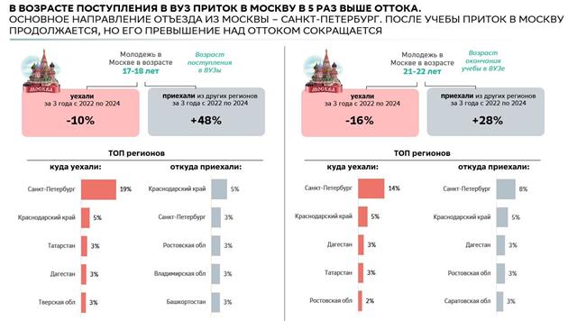 Тем не менее в ряде субъектов нетто-отток молодого населения остаётся значительным. Он характерен для регионов ЦФО, ПФО, ЮФО, Урала и Сибири. Положительный баланс отмечается в нефтегазодобывающих регионах (ХМАО, ЯНАО, Тюменская область), куда едут работать выпускники вузов, а также в южных и столичных регионах. Любопытно, что молодые москвичи, уезжающие учиться, чаще всего выбирают Санкт-Петербург (19% от общего числа уехавших).