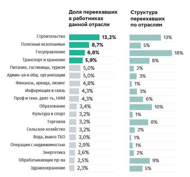 Мобильность сильно зависит от профессии. Лидеры по доле переехавших — строители (13,2%), работники добывающей отрасли (8,7%) и занятые в госуправлении (6,8%) и в транспортировке и хранении (5,9%). На противоположном полюсе — врачи. Только 2,3% медиков решились сменить регион ради работы.