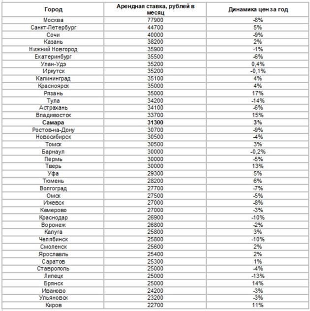 Средняя стоимость долгосрочной аренды жилья в России в декабре 2025 года составила 35 000 рублей в месяц — это на 2% меньше, чем в том же месяце прошлого года. Квартиру стало дешевле снять квартиру в Туле (-14%), Липецке (-13%), Краснодаре и Челябинске (-10% в каждом), Сочи и Ростове-на-Дону (-9% в обоих), Москве и Ижевске (-8%), Волгограде (-7%) и еще 13 крупных городах страны. Самые доступные объекты по итогам декабря 2025-го были в Кирове (22 700 рублей в месяц в среднем по всем форматам), Ульяновске (23 200 рублей), Иванове (24 200 рублей), Брянске, Липецке и Ставрополе (по 25 000 рублей). В Самаре средняя стоимость долгосрочной аренды квартиры составила 31,3 тыс рублей. Подробнее — в таблице 1.
