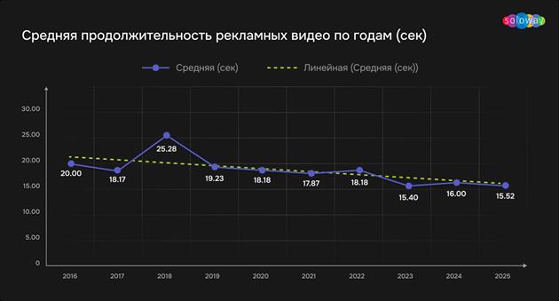 "Мы проанализировали рекламные кампании за последние 10 лет и увидели явный тренд на сокращение хронометража роликов. После пика в 2018 году средняя длительность роликов последовательно снижается и к 2023–2025 стабилизируется на уровне 15–16 секунд. Это отражает борьбу за внимание: выигрывают короткие форматы с сильным стартом и четким сообщением в первые секунды", — пресс-служба Soloway.