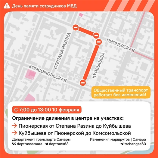 В День памяти сотрудников Главного Управления МВД России по Самарской области, погибших при исполнении служебных обязанностей, с 07:00 до 13:00 проезд транспорта, включая средства индивидуальной мобильности, будет ограничен на следующих участках в историческом центре Самары: