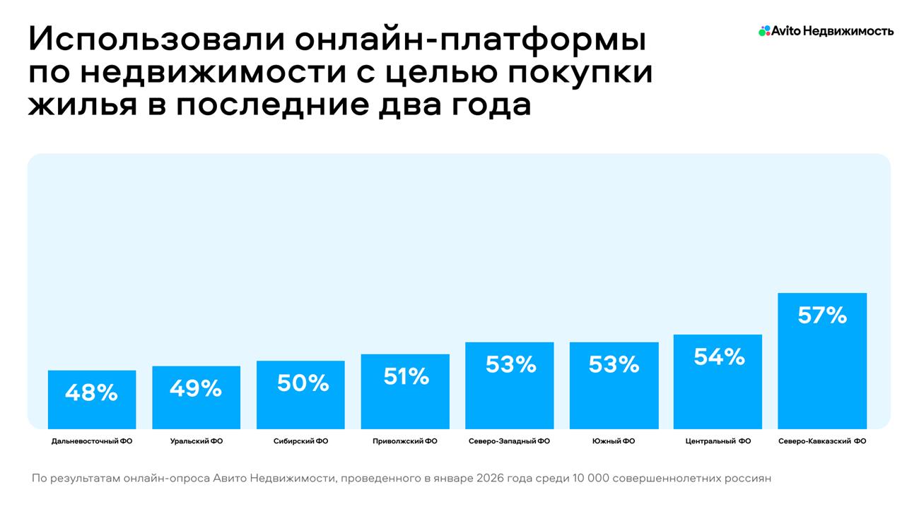 Основным каналом поиска и покупки жилья становятся онлайн-платформы: их используют 52% опрошенных россиян, а в Москве и Санкт-Петербурге доля достигает 59–62%. Отдельно среди опрошенных из ПФО доля занимает 51%. Важную роль при выборе занимают инструменты защиты пользователей: критерий безопасности становится основой поведения покупателей, а выбранные ими объекты проходят два этапа проверки.