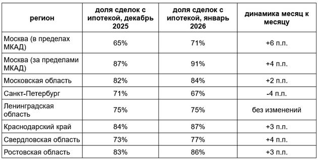 Рост доли ипотеки отмечается во многих крупных регионах. В Москве в январе 2026 года с использованием кредитного инструмента купили 71% квартир на первичном рынке в пределах МКАД и 91% — в Новой Москве (в декабре 2025 года: 65% и 87% соответственно). В Московской области доля сделок с ипотекой за месяц выросла с 82 до 84%, в Краснодарском крае — с 84 до 87%, в Свердловской области — с 73 до 77%, в Ростовской области — с 83 до 86%. Снижение доли сделок с ипотекой в январе 2026 года отмечалось в Санкт-Петербурге (с 71 до 67% за месяц), в Ленинградской области показатели остались на уровне декабря и составили 75%.