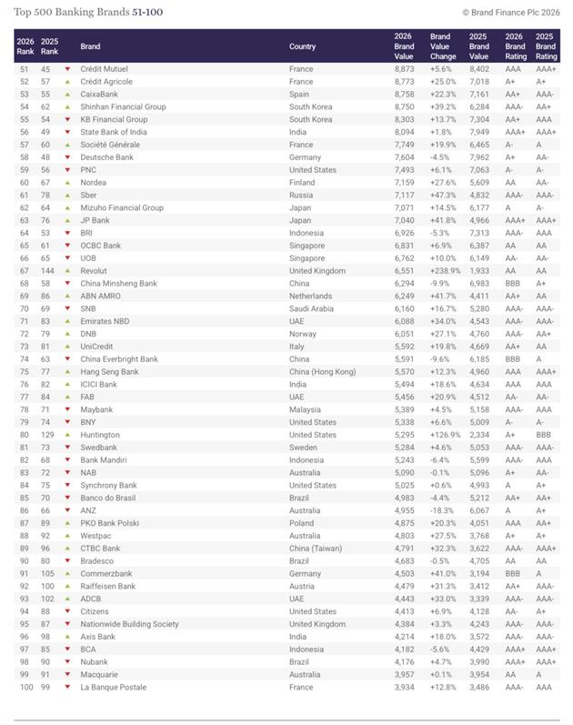 Лидерство в рейтинге сохранил китайский Industrial & Commercial Bank of China (ICBC), стоимость бренда которого за год выросла на 14,9% (до $90,8 млрд). Затем следует другой представитель Китая — China Construction Bank (-1,5% до $77,181 млрд). На третью позицию в этом году вышел Bank of China (+10,9% до $70,8 млрд), который обогнал Agricultural Bank Of China (-10,6% до $62,8 млрд). Всего же в первую "сотню" рейтинга вошли 15 банков из Китая.