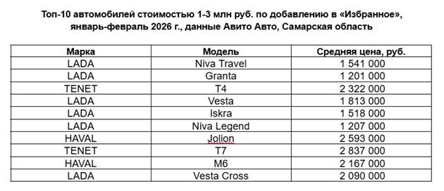 Эксперты Авито Авто изучили предпочтения жителей Самарской области в 2026 году и выяснили, какие новые автомобили стоимостью от 1 до 3 млн руб. пользователи чаще всего добавляли в раздел "Избранное". Лидерами по популярности стали LADA, TENET и HAVAL.