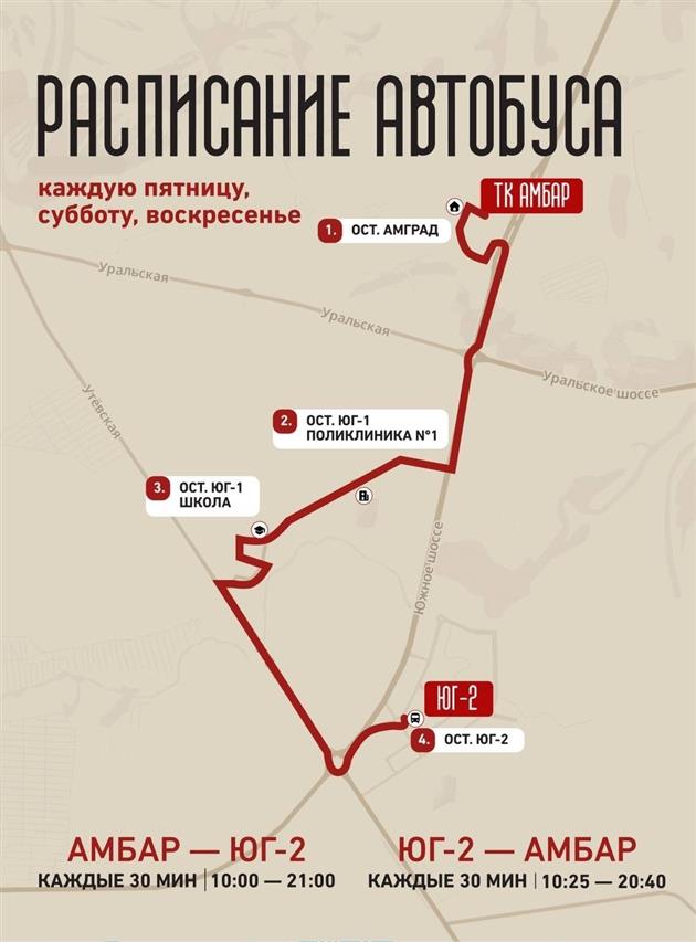 Маршрут пройдет через ключевые точки Южного города и "Амграда", связывая жилые кварталы с ТК "Амбар". Протяженность составляет 15,7 км, время в пути — около 35 минут. Автобусы будут курсировать по пятницам, субботам и воскресеньям с 10:00 до 21:00 с интервалом 30 минут. Проезд для пассажиров — бесплатный. Все расходы на организацию маршрута берет на себя холдинг "Глобал Вижн" — интегратор городской среды Самары.