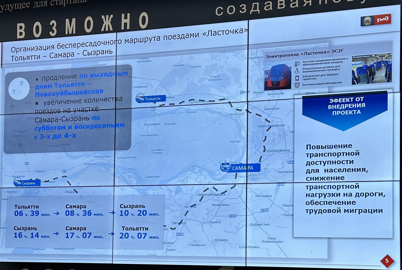 Расписание выглядит следующим образом: в 6:39 отправление из Тольятти, в 8:36 прибытие в Самару, в 10:20 - в Сызрань. В обратном направлении: отправление из Сызрани в 16:14, прибытие в Самару в 17:07, в Тольятти - 20:07.
