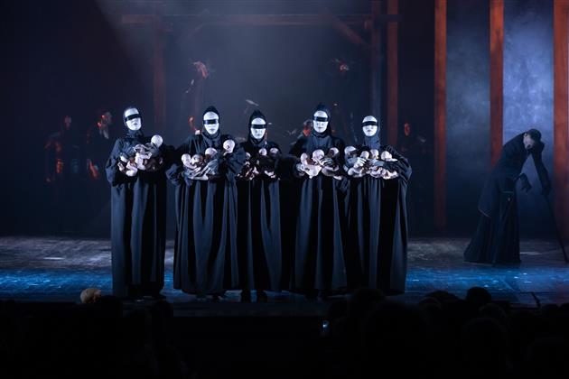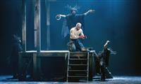 Между могилой и эшафотом разыгрывается история Гамлета в интерпретации режиссера-постановщика Дмитрия Акимова. Драка на кинжалах, висельники на сцене, ведьмы в латексе и терновый венец вместо короны, и все это под бодрый индастриал-марш Personal Jesus в интерпретации Мэнсона. Мрачно, но много смеха, того самого - слегка истерического, который придает происходящему оттенок абсурда. Абсолютно макабрический спектакль, где центральное место занимает не столько знаменитый монолог "Быть или не быть…", сколько рефреном повторяющиеся строки "Порвалась дней связующая нить. Как мне обрывки их соединить!" Хотя, возможно, тут более подошел бы другой вариант перевода также Бориса Пастернака: "Разлажен жизни ход, и в этот ад Закинут я, чтоб все пошло на лад!"