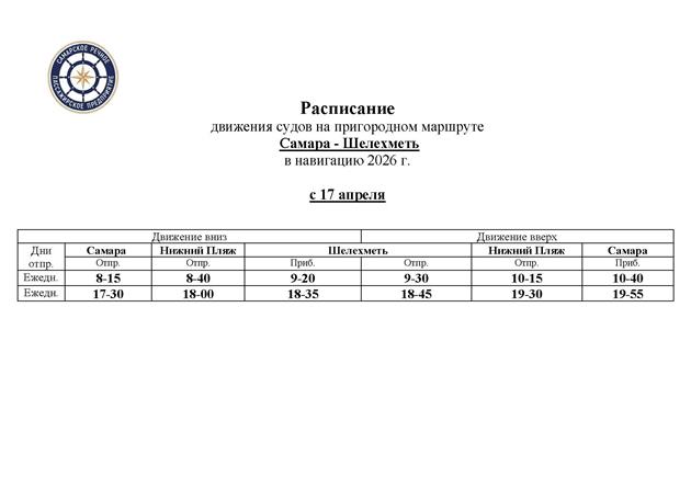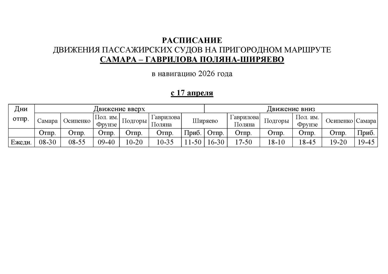 До Ширяево назначается один ежедневный рейс в 8:30. Он проследует с остановками "Осипенко", "Поляна им. Фрунзе", "Подгоры", "Гаврилова Поляна" и "Ширяево". В Самару можно будет отправиться на судне, отправляющимся в 16:30.