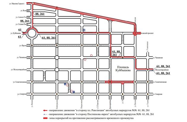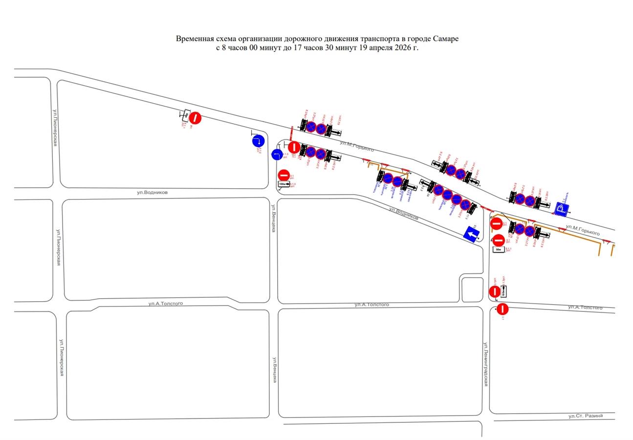 С 8:00 до 17:30 19 апреля по ул. Максима Горького от ул. Венцека до ул. Вилоновской, по ул. Вилоновской от ул. Максима Горького до Волжского проспекта, по Волжскому проспекту от ул. Маяковского до ул. Лесной, по ул. Лесной от Волжского проспекта до Северо-Восточной магистрали, по Северо-Восточной магистрали от ул. Лесной до ул. Ново-Садовой.